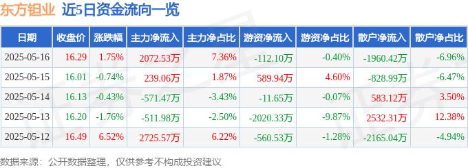 本站消息,截至2025年5月16日收盘,东方钽业(000962)报收于16.29元,上涨1.75%,换手率3.43%,成交量17.14万手,成交额2.82亿元。